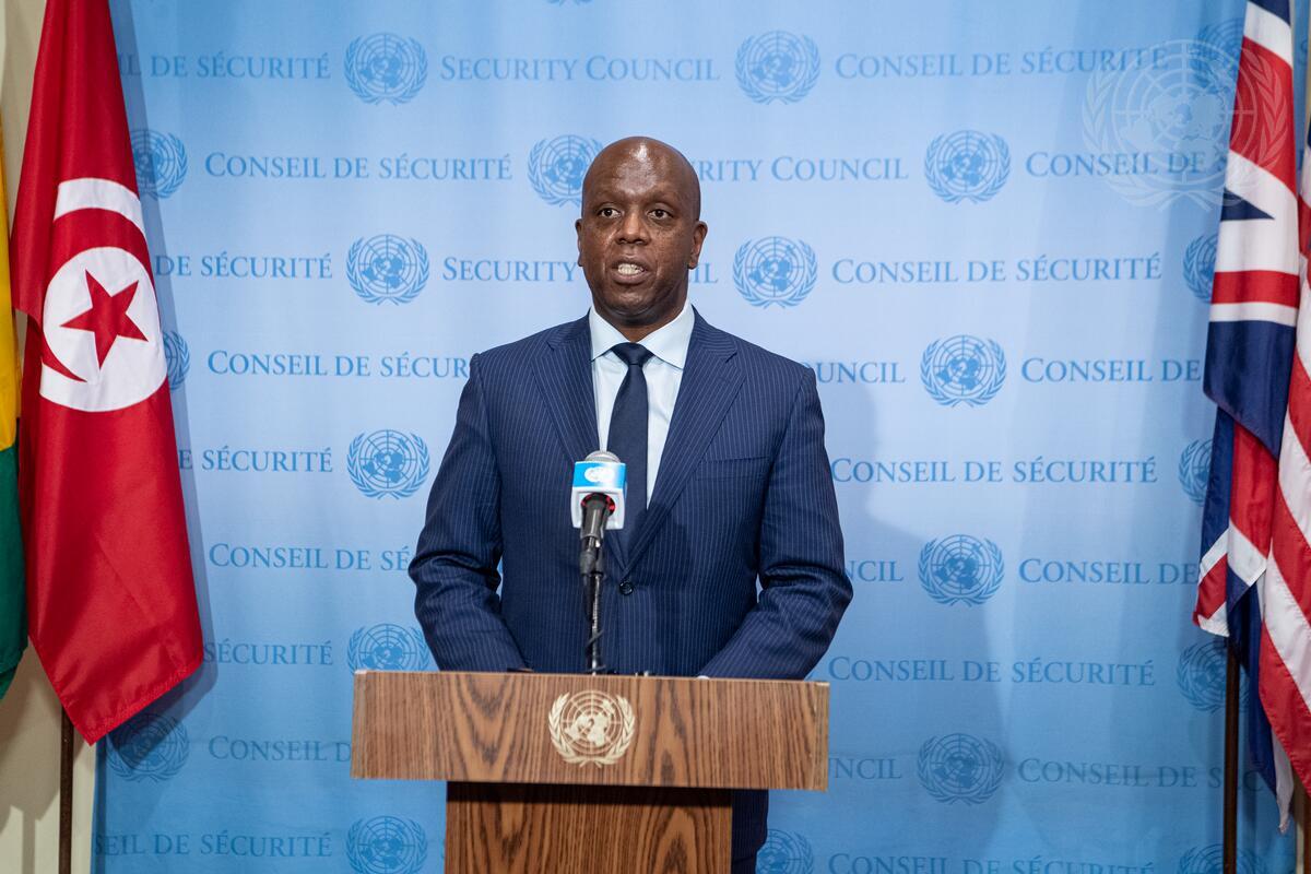 Martin Kimani, Permanent Representative of the Republic of Kenya to the United Nations, speaks during the flag installation ceremony for the incoming non-permanent members of the Security Council.