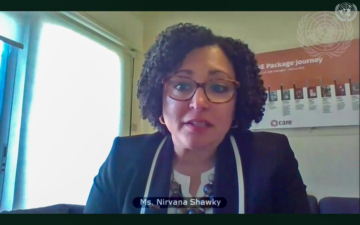 Nirvana Shawky, CARE’s Regional Director for the Middle East and North Africa, addresses the videoconference with Security Council members in connection with the Middle East (Yemen).