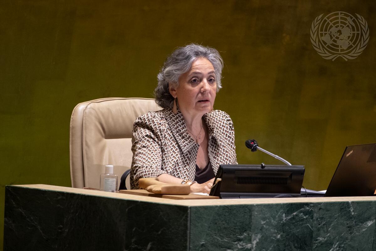Isabelle F. Picco, Permanent Representative of the Principality of Monaco to the United Nations and Vice-President of the seventy-fifth session of the United Nations General Assembly, chairs the General Assembly meeting on protracted conflicts in the GUAM area and their implications for international peace, security and development, and other matters.