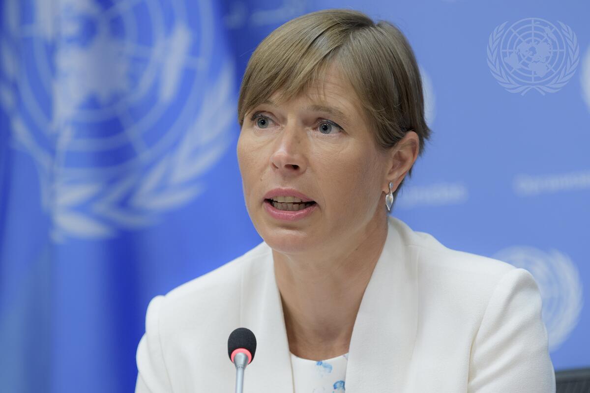 Kersti Kaljulaid, President of Estonia, briefs reporters on her new role as Global Advocate for Every Woman Every Child.