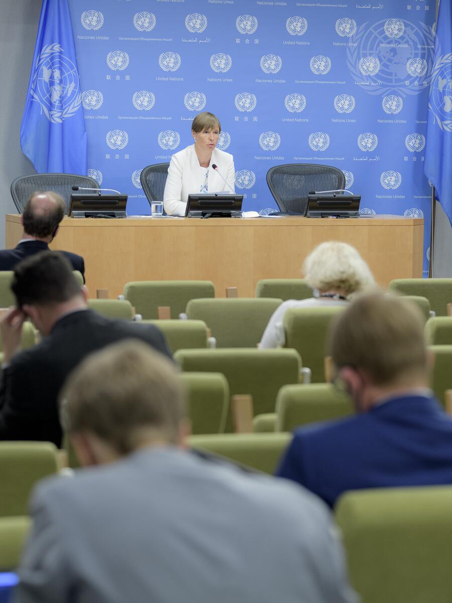 Kersti Kaljulaid, President of Estonia, briefs reporters on her new role as Global Advocate for Every Woman Every Child