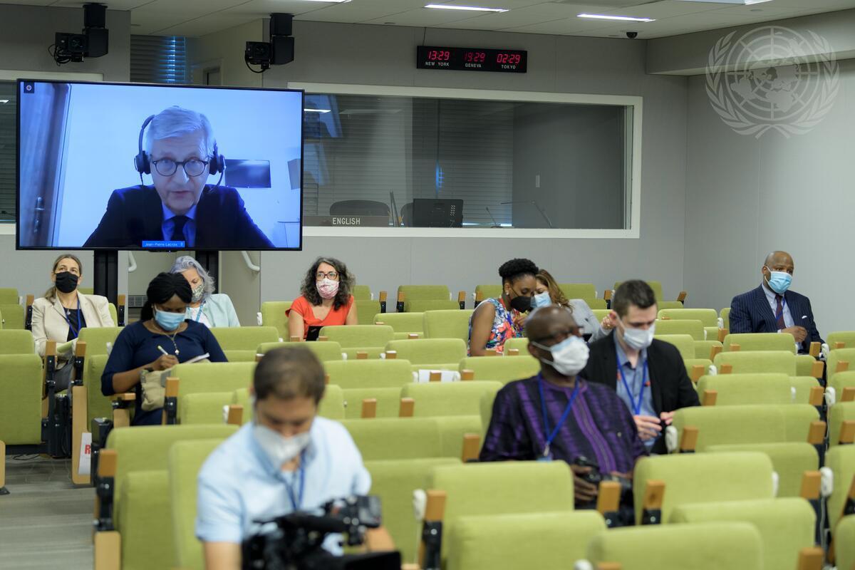Jean-Pierre Lacroix (on screen), Under-Secretary-General for Peace Operations, briefs reporters on the virtual high-level meeting on "Strengthening the Conduct of Peacekeeping Personnel". With him were (not pictured) Catherine Pollard, Under-Secretary-General for Management Strategy, Policy and Compliance, and Mathu Joyini, Permanent Representative of South Africa to the United Nations.