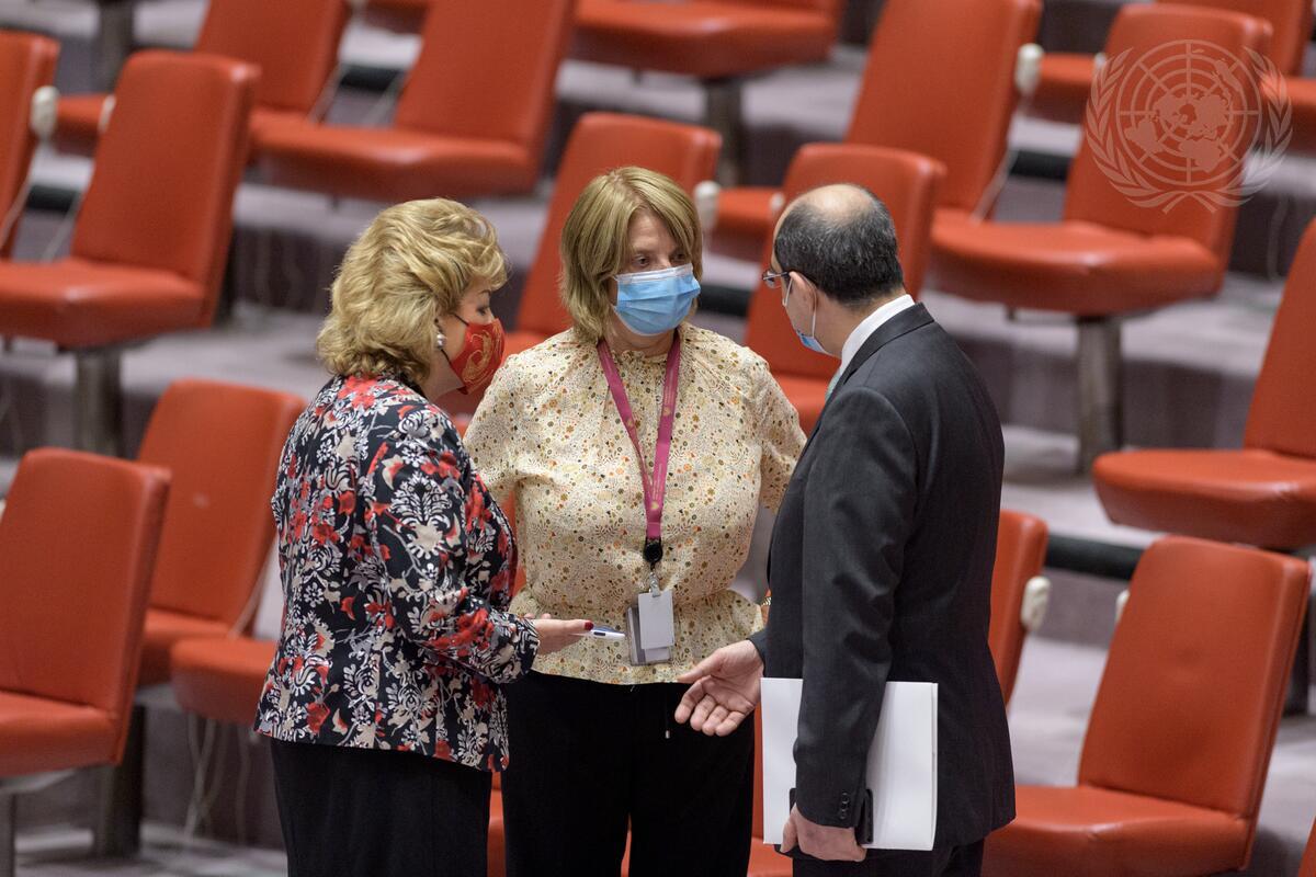 Geraldine Byrne Nason (left), Permanent Representative of Ireland to the United Nations, and Mona Juul (left), Permanent Representative of Norway to the United Nations, speaks with