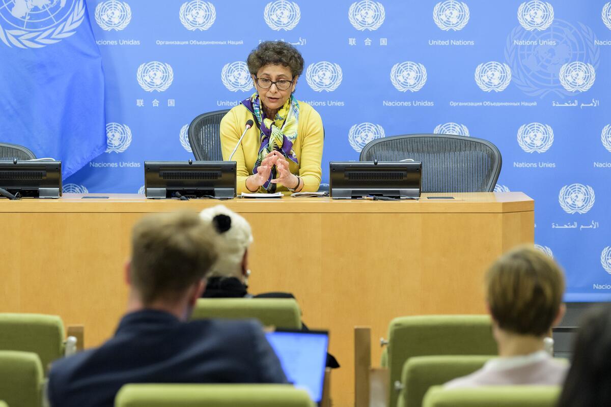 Irene Khan, Special Rapporteur on the promotion and protection of the right to freedom of opinion and expression, briefs reporters.