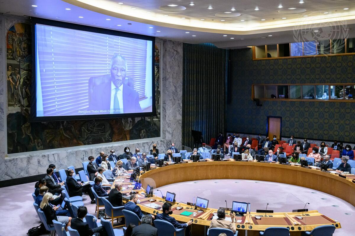 Thabo Mbeki (on screen), former President of South Africa, addresses the Security Council meeting on peacebuilding and sustaining peace, with a focus on diversity, state building and the search for peace.