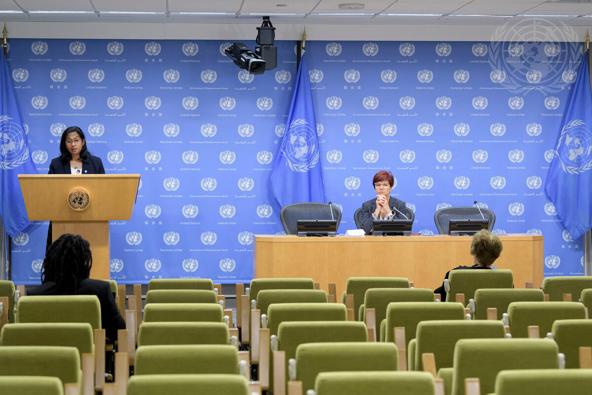 Chantal Line Carpentier (at dais), Chief of the UN Conference on Trade and Development (UNCTAD) New York office, briefs press on the launch of the Digital Economy Report 2019.