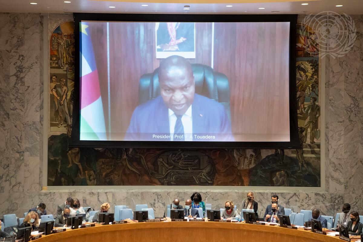 Faustin-Archange Touadera (on screen), President of the Central African Republic, addresses the Security Council meeting on the situation in the Central African Republic.