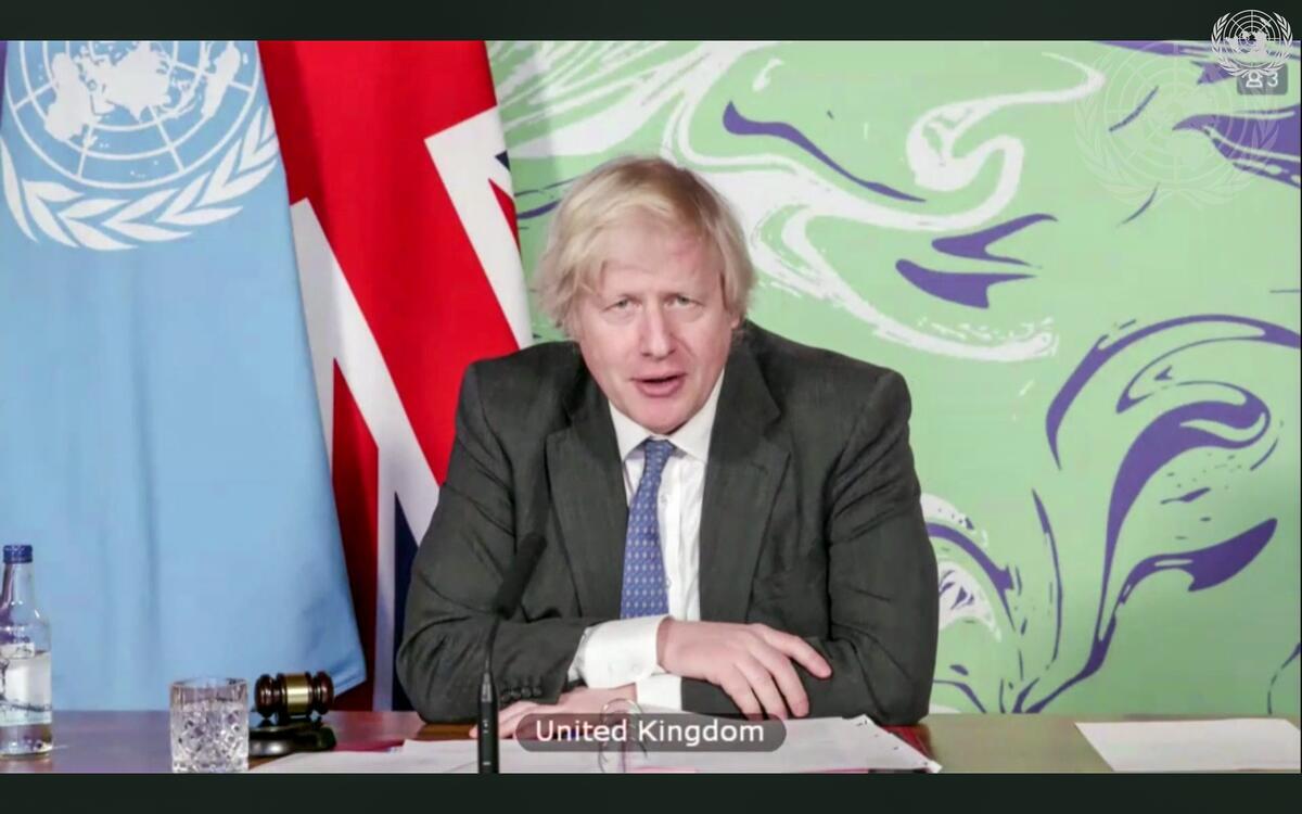 Boris Johnson, Prime Minister of the United Kingdom and President of the Security Council for February, chairs the videoconference with Security Council members in connection with Maintenance of international peace and security: Climate and security.