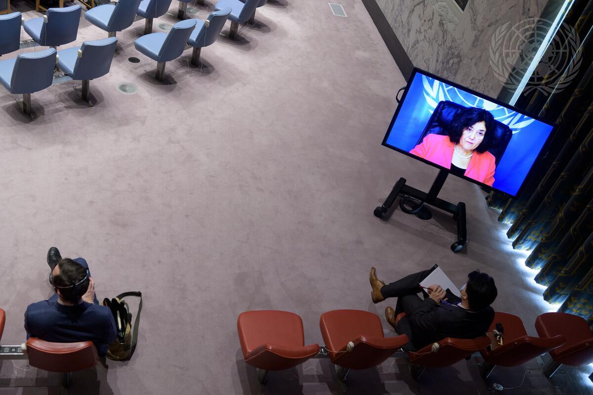 Leila Zerrougui (on screen), Special Representative of the Secretary-General and Head of the United Nations Organization Stabilization Mission in the Democratic Republic of the Congo (MONUSCO), briefs the Security Council meeting on the situation concerning the Democratic Republic of the Congo.