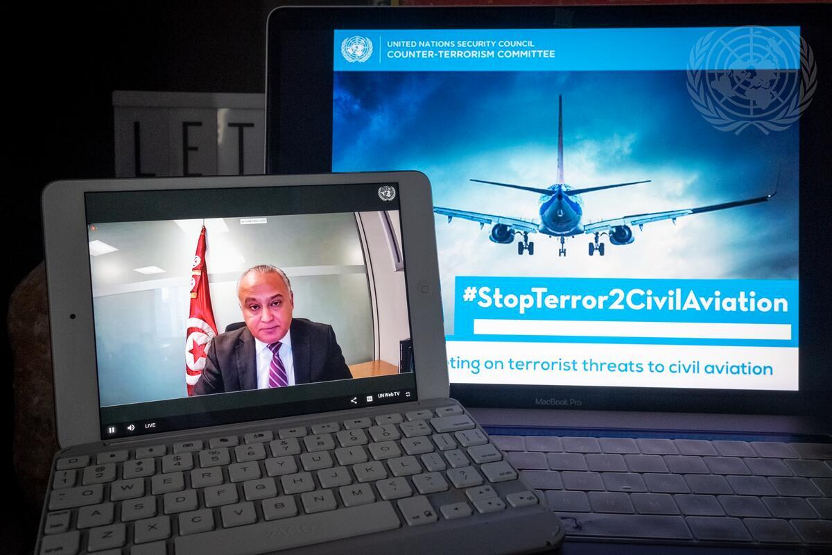 Tarek Ladeb, Chair of the Counter-Terrorism Committee and Permanent Representative of the Republic of Tunisia to the United Nations, makes an opening statement to the virtual open briefing of the Counter-Terrorism Committee on "Terrorist threats to civil aviation, the status of implementation of Security Council resolution 2309 (2016), and follow-up to the civil aviation-related provisions of Council resolution 2396 (2017)".