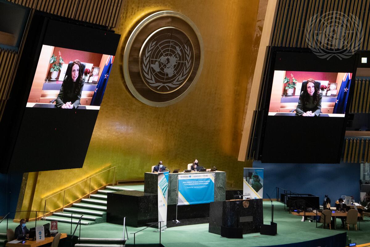 Jacinda Ardern (on screens), Prime Minister of New Zealand, addresses the meeting.