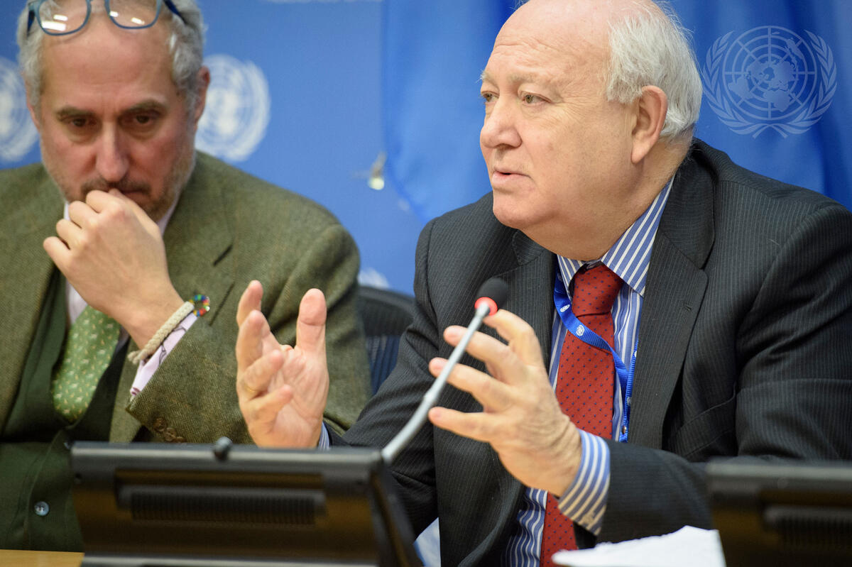 Miguel Ángel Moratinos (right), High Representative for the United Nations Alliance of Civilizations (UNAOC), briefs reporters as a guest at the noon briefing. At left is Stéphane Dujarric, Spokesman for the Secretary-General.