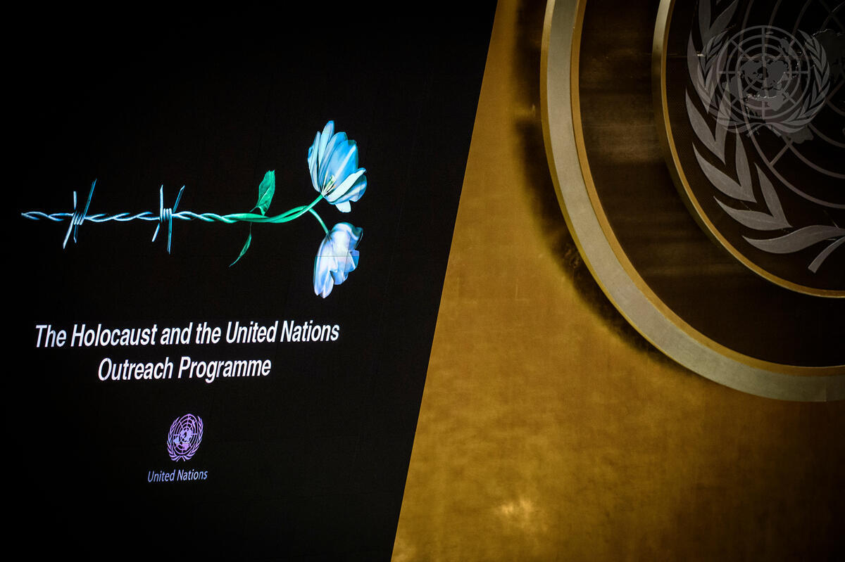 A view of a screen in the General Assembly Hall during the Holocaust Remembrance Ceremony on the theme "Demand and Defend Your Human Rights".
