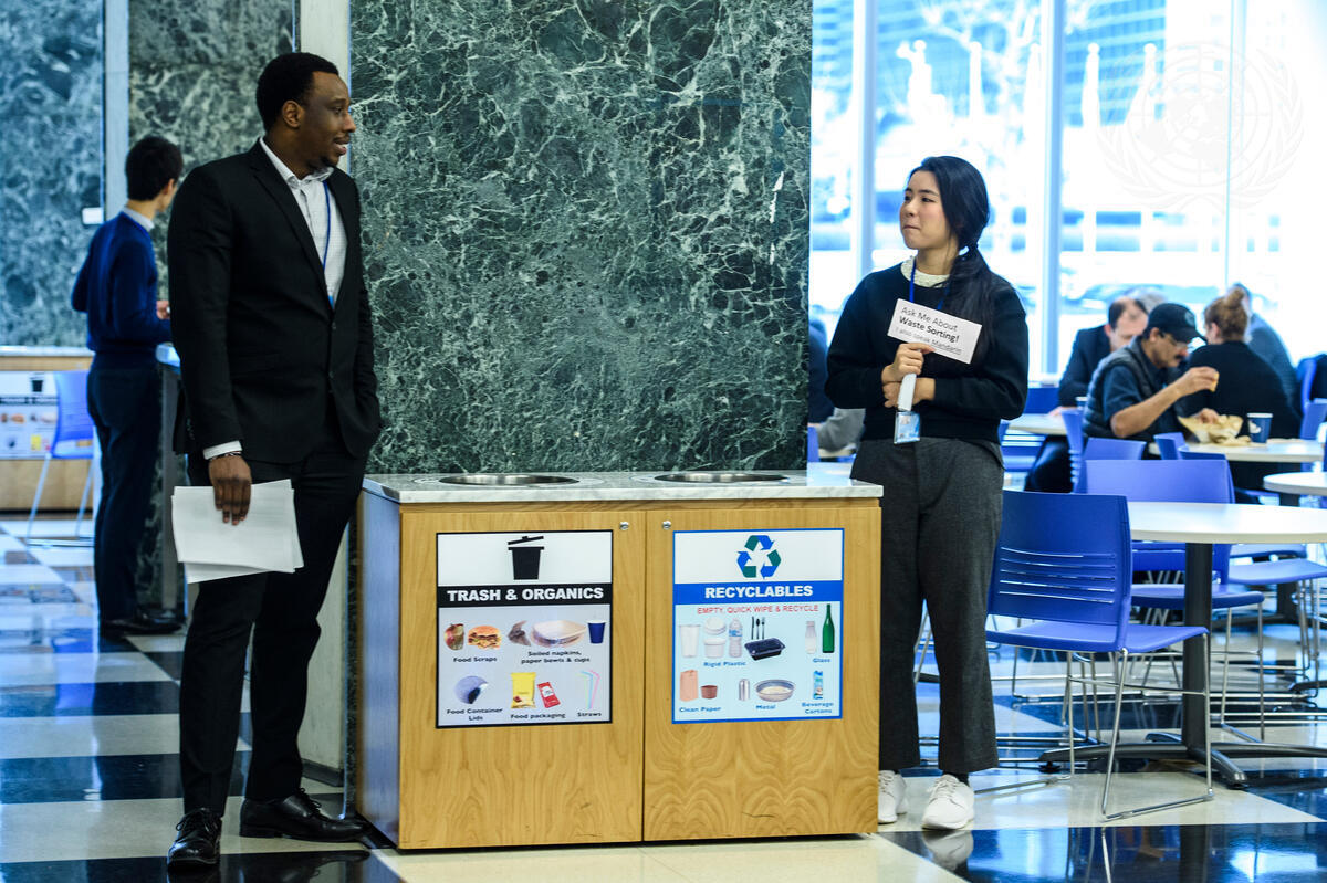 A staff member holds a sign saying ""Ask Me About Waste Sorting"" as she stands beside waste and recycling bins at UN Headquarters, ready to answer any questions.