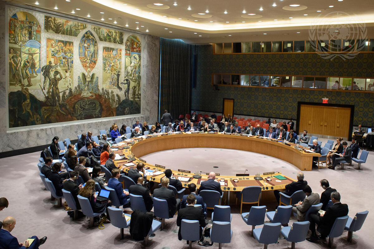 A wide view of the Security Council chamber as Mark Lowcock (right at far end of table), Under-Secretary-General for Humanitarian Affairs and Emergency Relief Coordinator, briefs the Council on the situation in the Middle East (Syria).