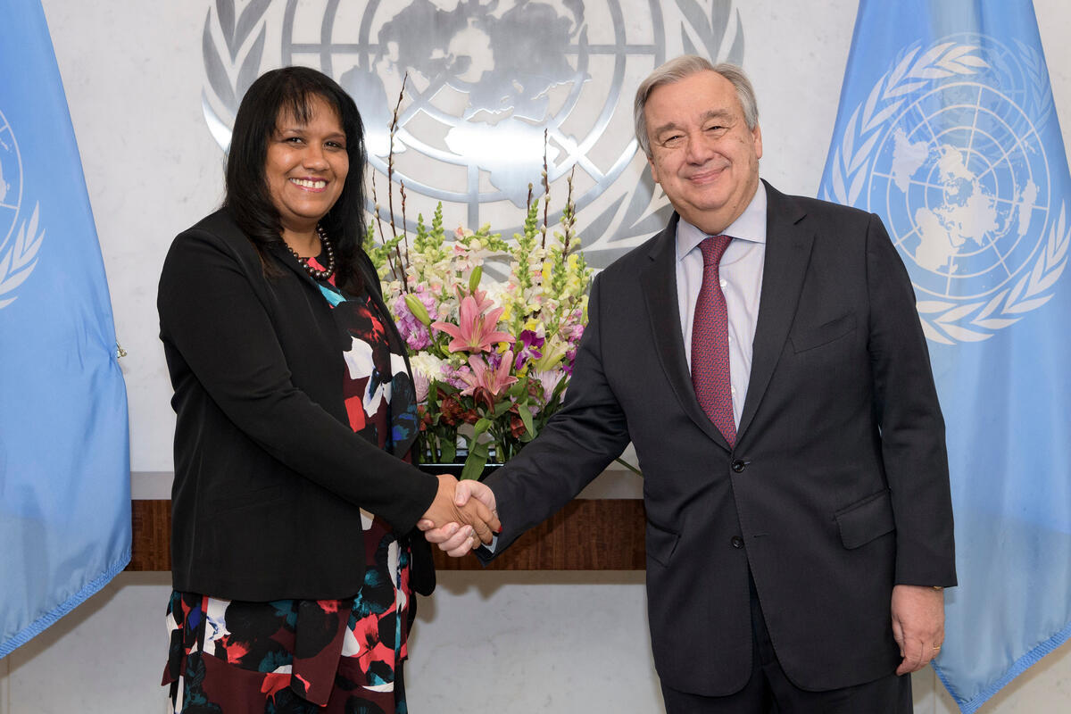 Anayansi Rodríguez Camejo (left) outgoing Permanent Representative of Cuba to the United Nations, pays a farewell call on Secretary-General António Guterres.