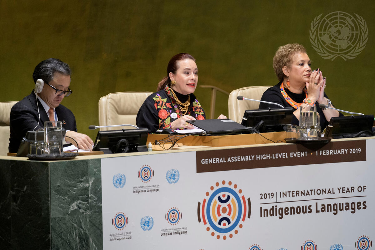 María Fernanda Espinosa Garcés (centre), President of the seventy-third session of the General Assembly, addresses the high-level event held to launch the International Year of Indigenous Languages. At left is Liu Zhenmin, Under-Secretary-General for Economic and Social Affairs, and at right is Catherine Pollard, Under-Secretary-General for General Assembly Affairs and Conference Management.