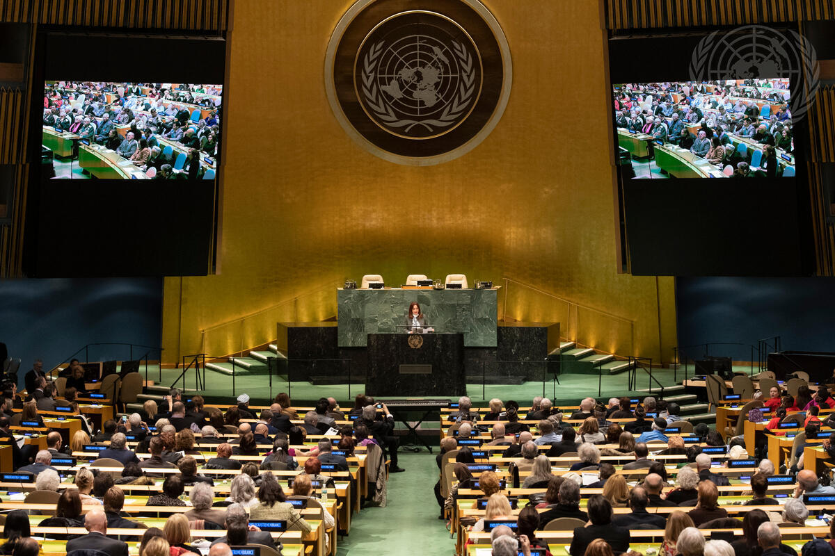 María Fernanda Espinosa Garcés (at podium), President of the seventy-third session of the General Assembly, makes remarks during the Holocaust Remembrance Ceremony on the theme ""Demand and Defend Your Human Rights"".