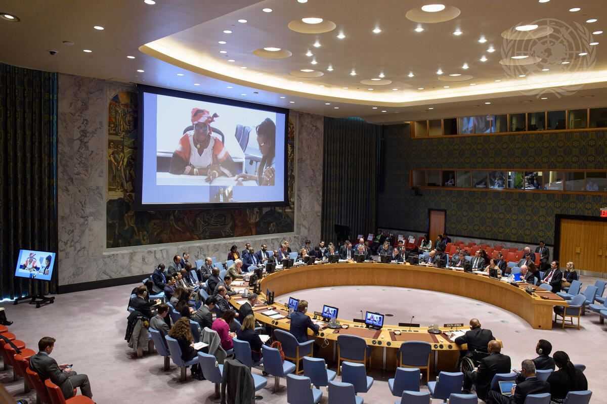 A wide view of the Security Council as Florentina Adenike-Ukonga (on screen), Executive Secretary of the Gulf of Guinea Commission, addresses the Security Council meeting on the maintenance of international peace and security. The focus of the meeting was on transnational organized crime at sea as a threat to international peace and security.