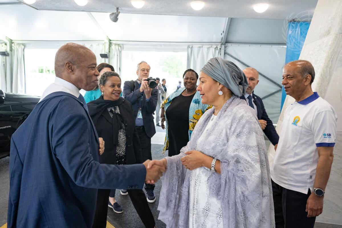 Deputy Secretary-General Amina Mohammed (front centre) greets Eric Adams, Mayor of New York City.