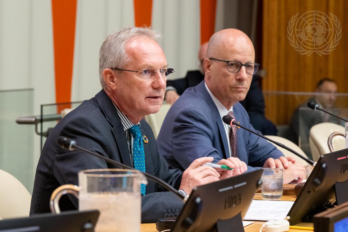 Csaba Kőrösi, President of the seventy-seventh session of the United Nations General Assembly, speaks during a Civil Society Townhall. At right is Maher Nasser, Director of the Outreach Division of UN Department of Global Communications.