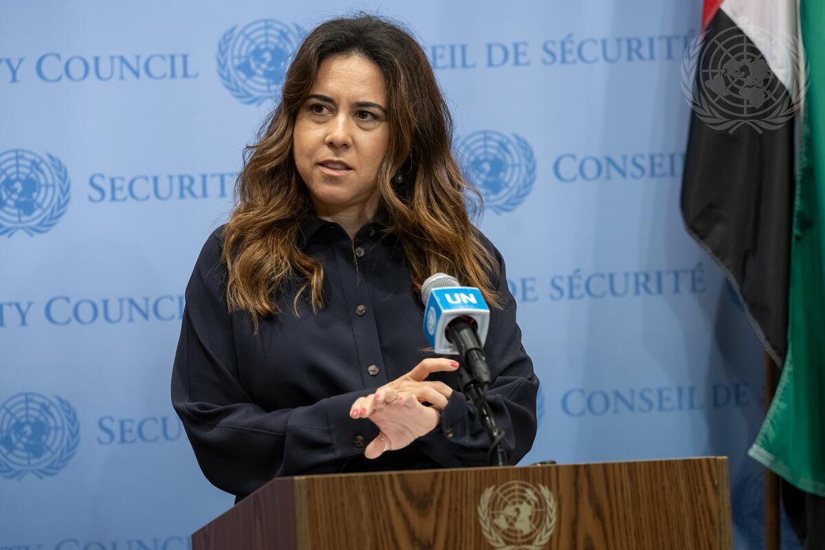 Lana Zaki Nusseibeh, Permanent Representative of the United Arab Emirates to the United Nations and President of the Security Council for the month of June, briefs reporters ahead of the Security Council meeting on the situation in the Middle East, including the Palestinian question.