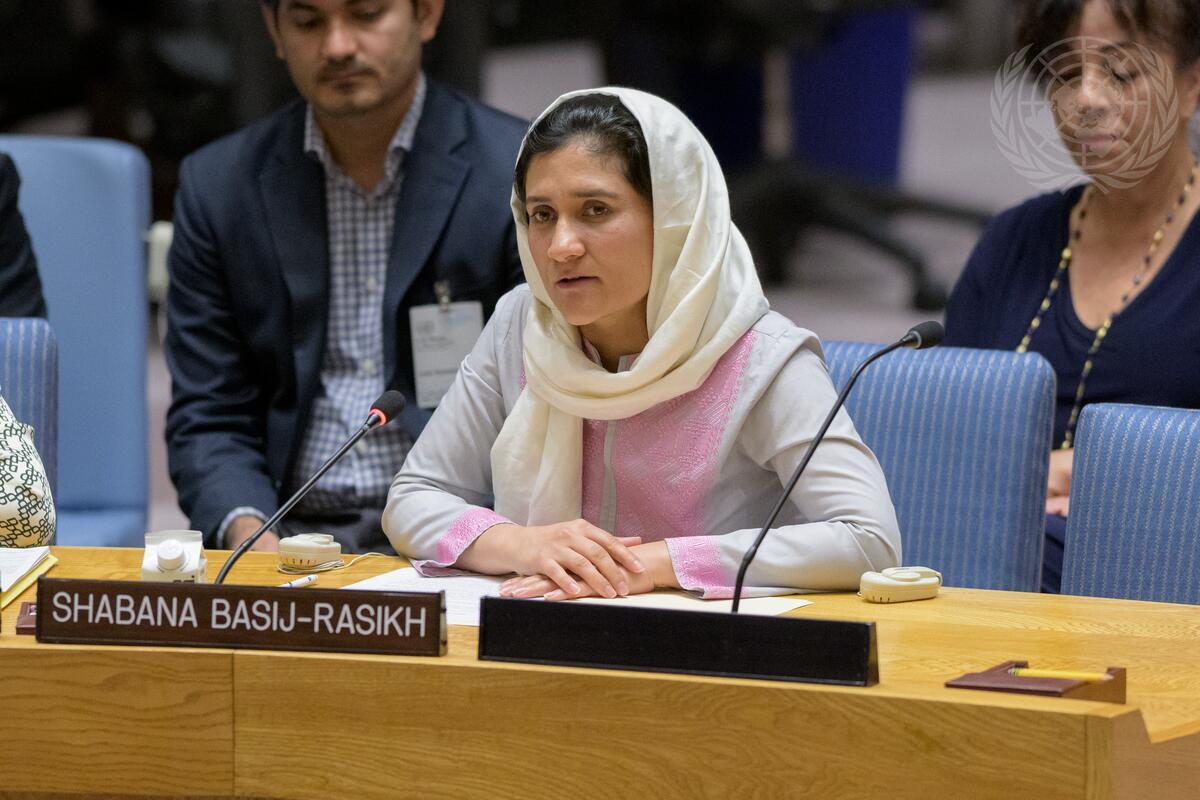 Shabana Basij-Rasikh, Co-founder and President of the School of Leadership, Afghanistan (SOLA), briefs the Security Council meeting on the situation in Afghanistan.