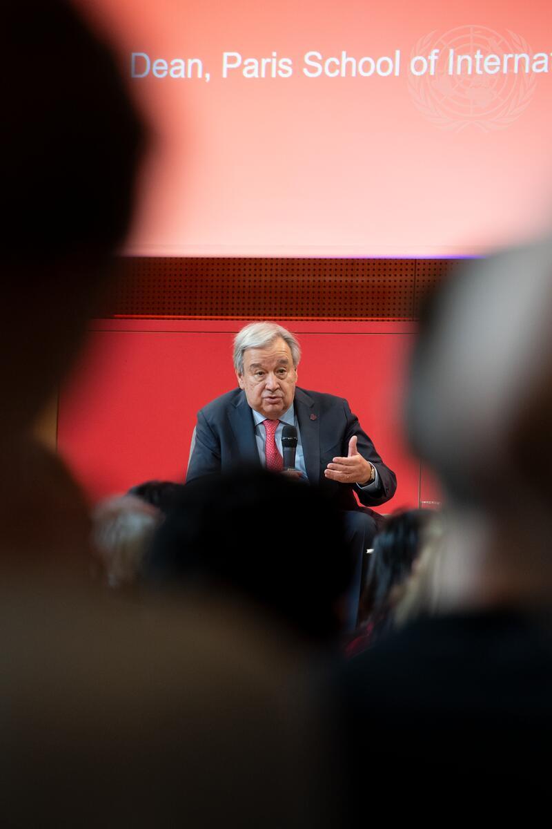 Secretary-General António Guterres speaks at the Institute of Political Sciences, or Sciences Po, in Paris.