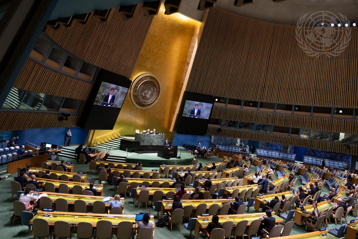 A wide view of the General Assembly Hall as Olivier Maes (at dais and on screens), Permanent Representative of Luxembourg to the United Nations, introduces a draft resolution to the General Assembly on an Independent Institution on Missing Persons in the Syrian Arab Republic under agenda item Integrated and coordinated implementation of and follow-up to the outcomes of the major United Nations conferences and summits in the economic, social and related fields. The resolution was adopted by a recorded vote of 83 in favour to 11 against, with 62 abstentions.