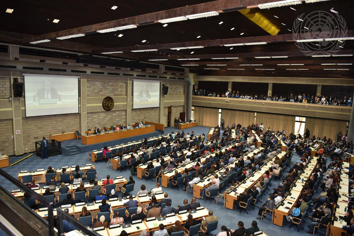 A wide view of the townhall meeting with Secretary-General António Guterres (on screens) and the UN Staff in Nairobi, Kenya.