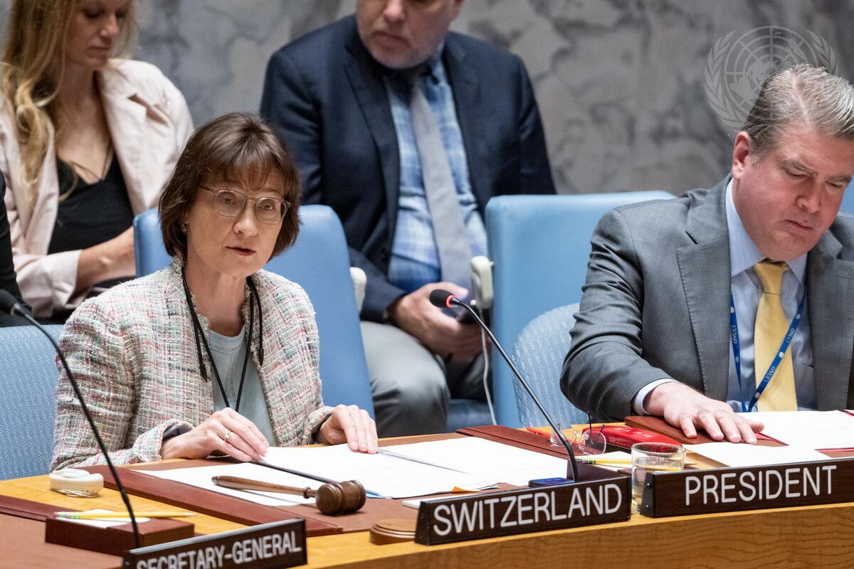 Pascale Baeriswyl, Permanent Representative of the Swiss Confederation and President of the Security Council for the Month of May, chairs the Security Council meeting on the situation in the Middle East (Syria).