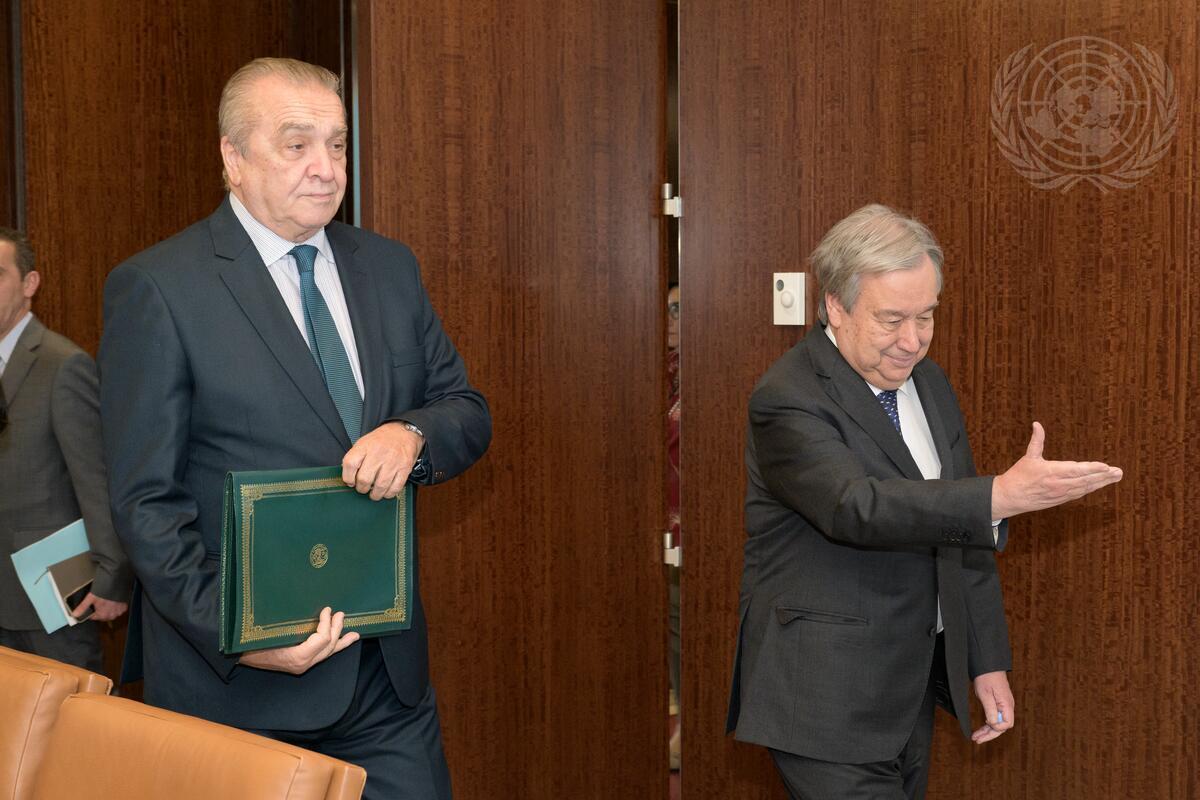 Amar Bendjama (left), Permanent Representative of the People’s Democratic Republic of Algeria, presents his credentials to Secretary-General António Guterres.