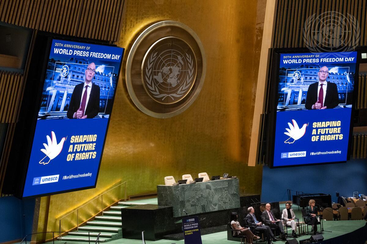 Volker Türk (on screens), United Nations High Commissioner for Human Rights, addresses the commemoration of the 30th Anniversary of World Press Freedom Day on the theme “Shaping a Future of Rights: Freedom of expression as a driver for all other human rights”. The event is organized by the United Nations Educational, Scientific and Cultural Organization (UNESCO).