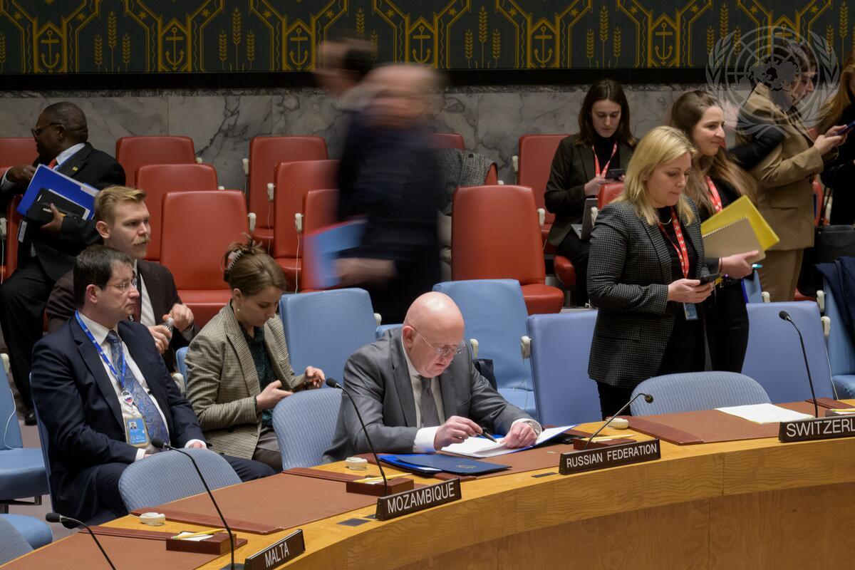 Vassily Nebenzia, Permanent Representative of Russia to the UN, addresses the Security Council meeting on maintenance of peace and security of Ukraine.