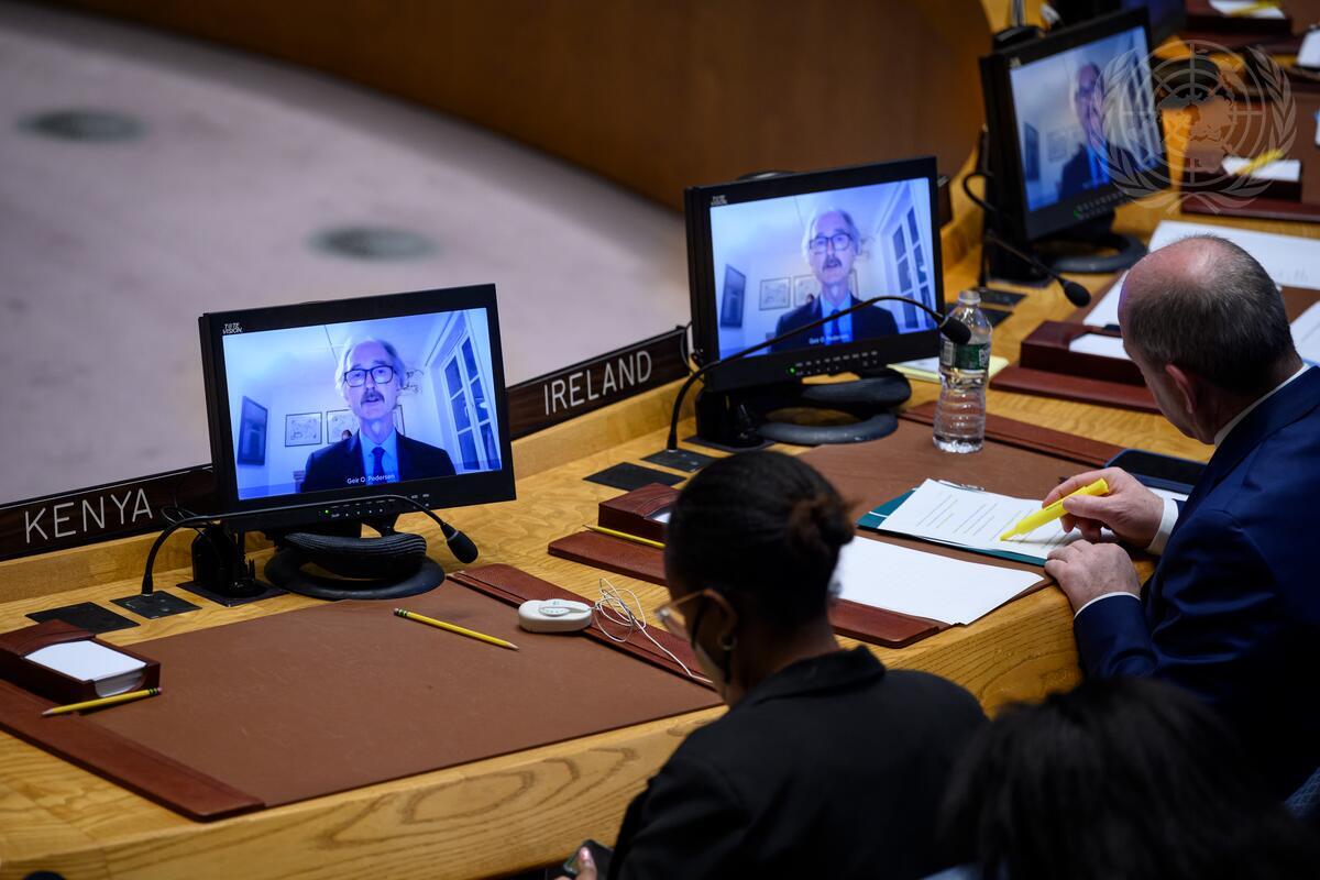 Geir Pedersen (on screens), Special Envoy of the Secretary-General for Syria, briefs the Security Council meeting on the situation in the Middle East (Syria). The Council heard a report of the Secretary-General on the humanitarian needs in the Syrian Arab Republic.