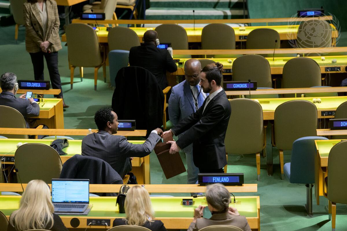 A view of the General Assembly plenary meeting where it considered ”Integrated and coordinated implementation of and follow-up to the outcomes of the major United Nations conferences and summits in the economic, social and related fields” and “Election of the Executive Director of the United Nations Environment Programme (UNEP)”.