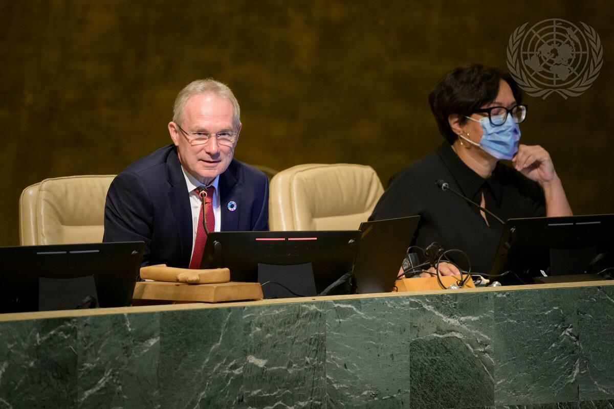 Csaba Kőrösi (left), President of the seventy-seventh session of the United Nations General Assembly, addresses the General Assembly plenary meeting on ”Integrated and coordinated implementation of and follow-up to the outcomes of the major United Nations conferences and summits in the economic, social and related fields” and “Election of the Executive Director of the United Nations Environment Programme (UNEP)”.