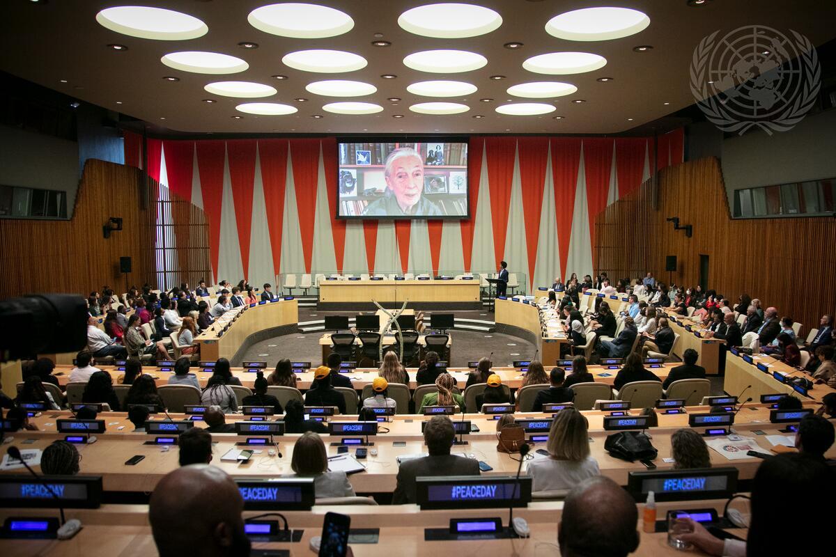 Jane Goodall (on screen) speaks during the International Day of Peace youth observance held on the theme "End racism. Build peace."