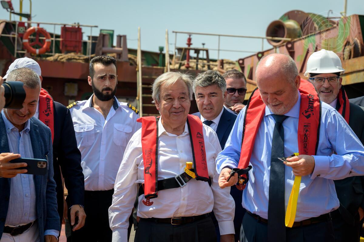 Secretary-General António Guterres (centre) travelled to Istanbul and oversaw the departure of two ships involved in the Black Sea Grain Initiative, a UN-brokered operation to bring urgently needed hunger relief to the Horn of Africa.