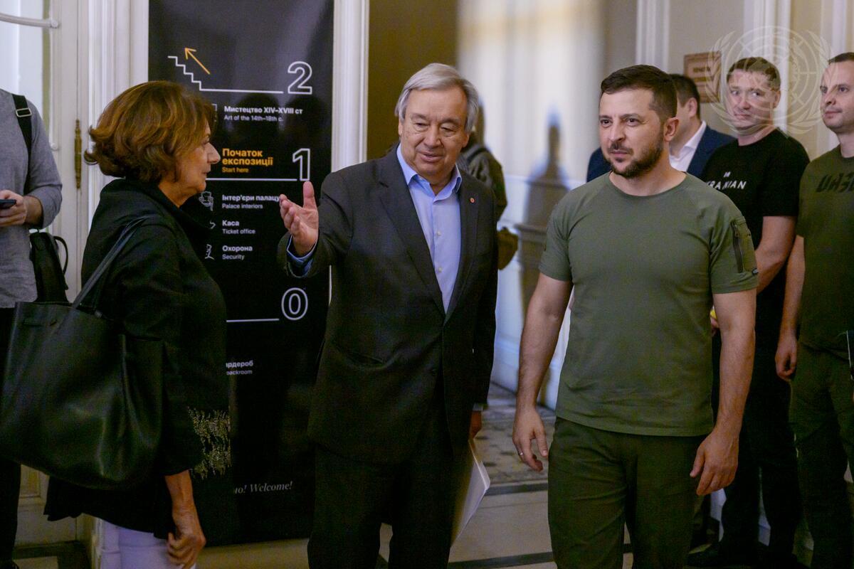 Secretary-General António Guterres (centre) and Rosemary A. DiCarlo (left), Under-Secretary-General for Political and Peacebuilding Affairs, meet with Volodymyr Zelenskyy, President of Ukraine, in Lviv, Ukraine. At the invitation of President Zelinskyy, the Secretary-General travelled to Ukraine to attend a trilateral meeting with President Recep Tayyip Erdogan of Turkïye and the Ukrainian leader.