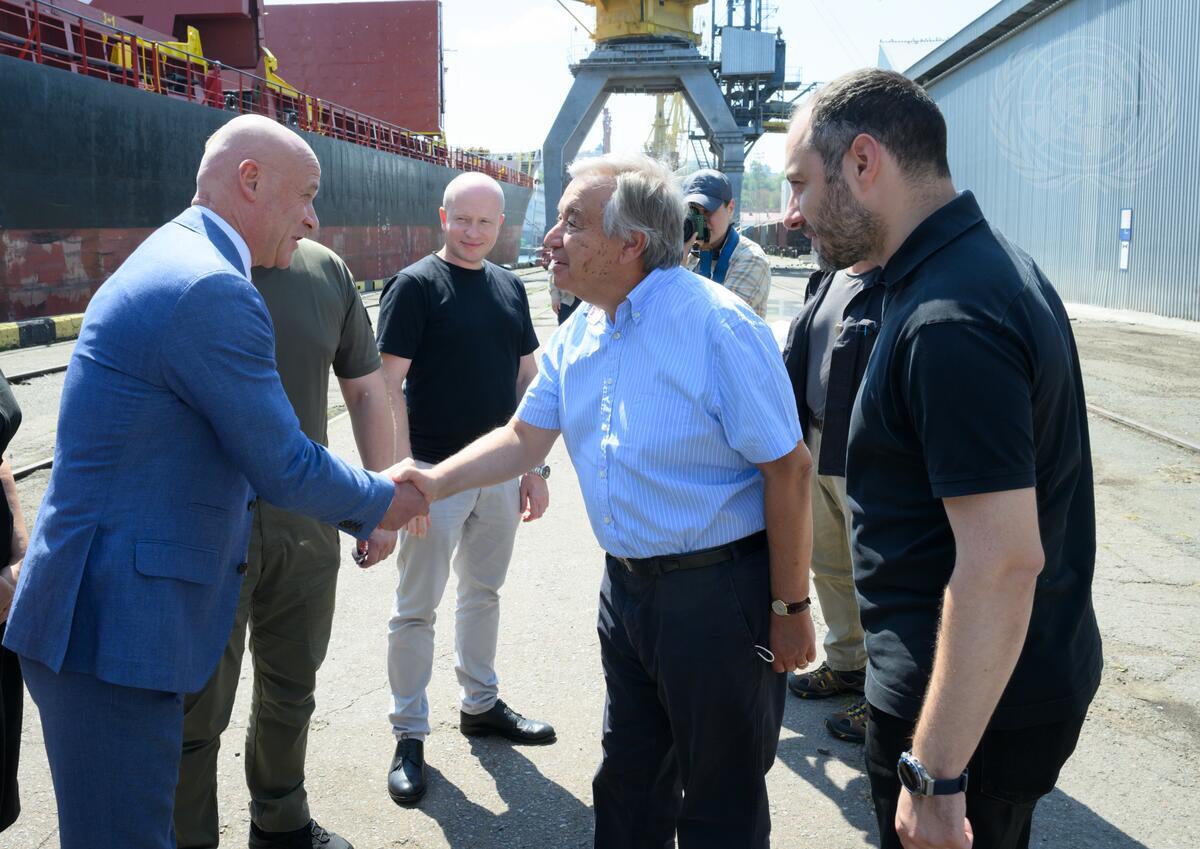 Secretary-General António Guterres (centre) shakes hands with Gennadiy Trukhanov, Mayor of Odesa.