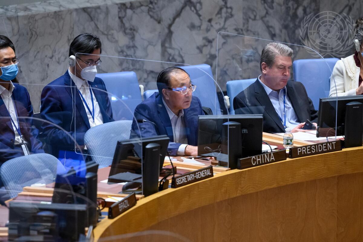 Zhang Jun, Permanent Representative of China and President of the Security Council for the month of August, chairs the Security Council meeting on the situation in the Middle East, including the Palestinian question.