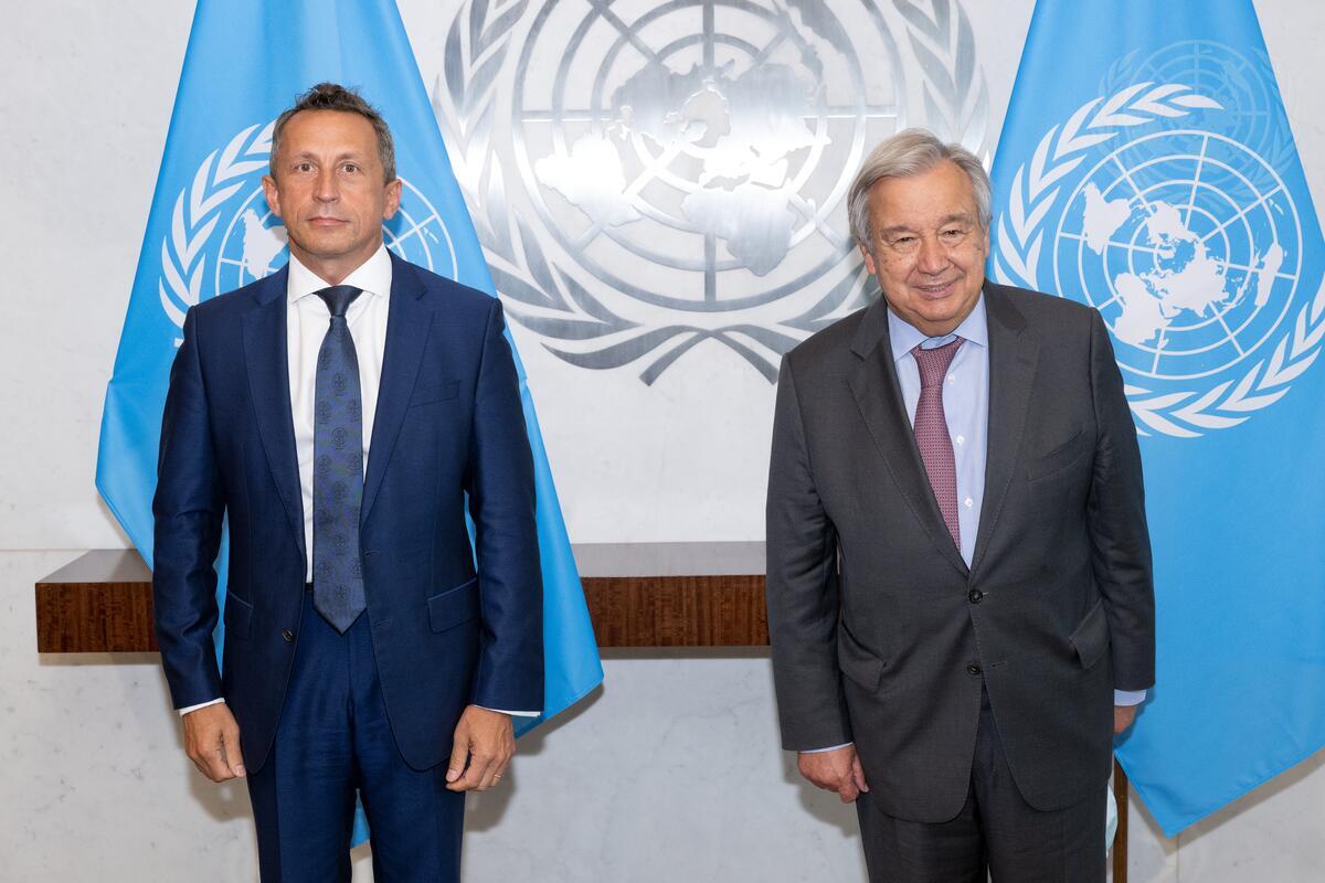 Rein Tammsaar (left), Permanent Representative of Republic of Estonia to the United Nations, presents his credentials to Secretary-General António Guterres.