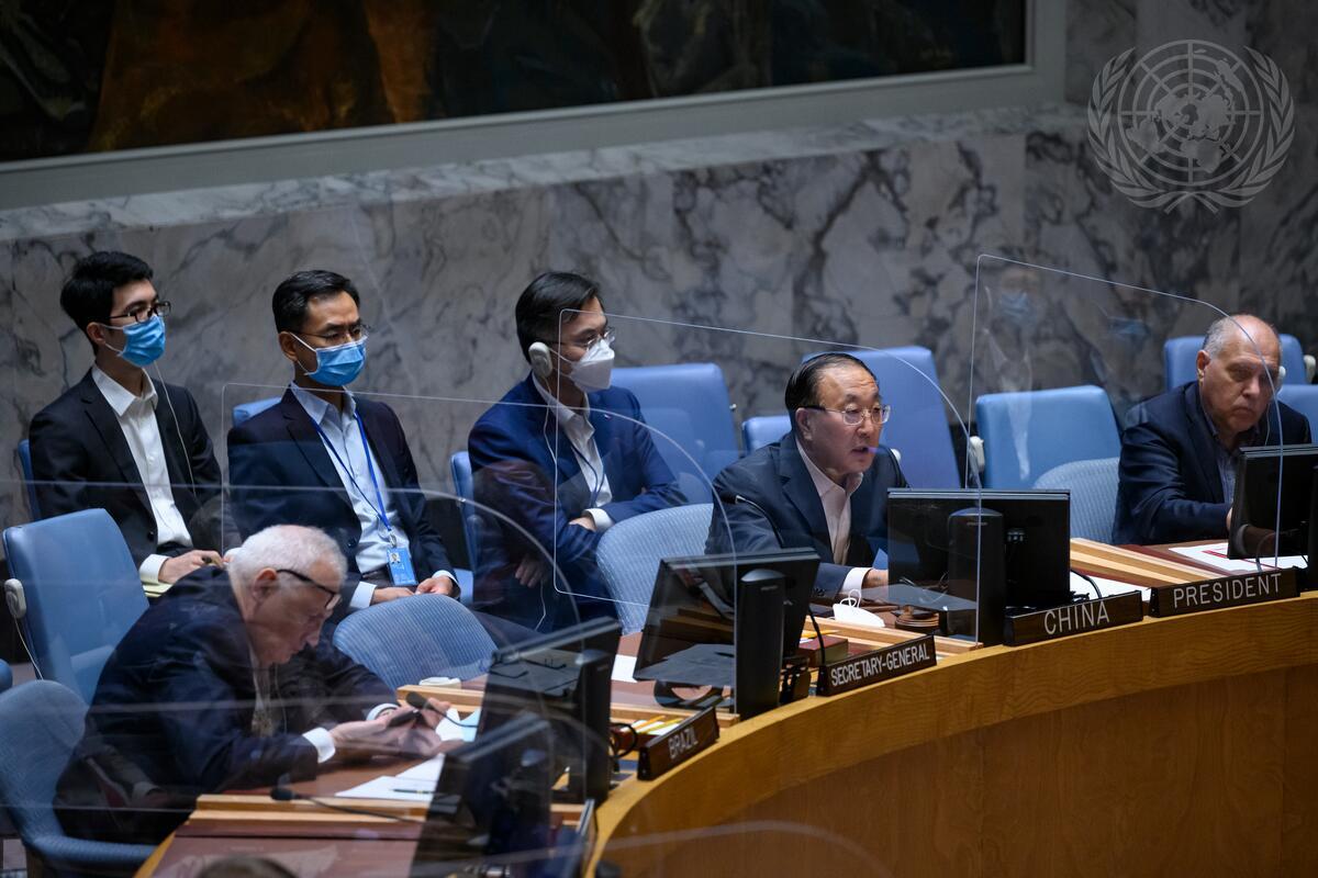 Zhang Jun (centre), Permanent Representative of China and President of the Security Council for the month of August, chairs the Security Council meeting on the situation in Afghanistan.