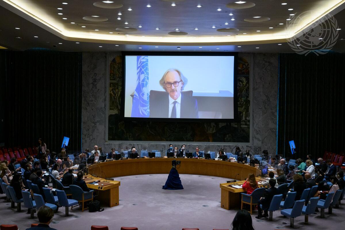 Geir Pedersen (on screen), Special Envoy of the Secretary-General for Syria, briefs the Security Council meeting on the situation in the Middle East (Syria).