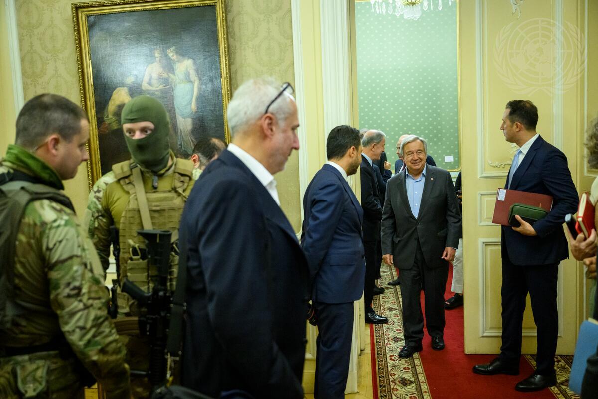 Secretary-General António Guterres (second from right) attends a trilateral meeting in Lviv, Ukraine, with President Volodymyr Zelinskyy of Ukraine and President Recep Tayyip Erdogan of Turkïye.