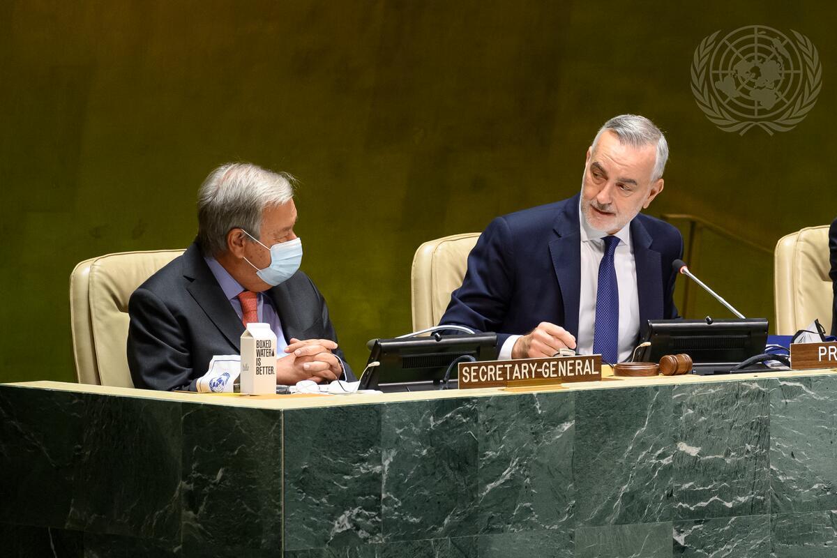 Gustavo Zlauvinen (right), President of the Review Conference for the Nuclear Non-proliferation Treaty (NPT), speaks with Secretary-General António Guterres ahead of the opening meeting and commencement of general debate of the Tenth Review Conference of the Parties to the Treaty on the Non-Proliferation of Nuclear Weapons (1-26 August).