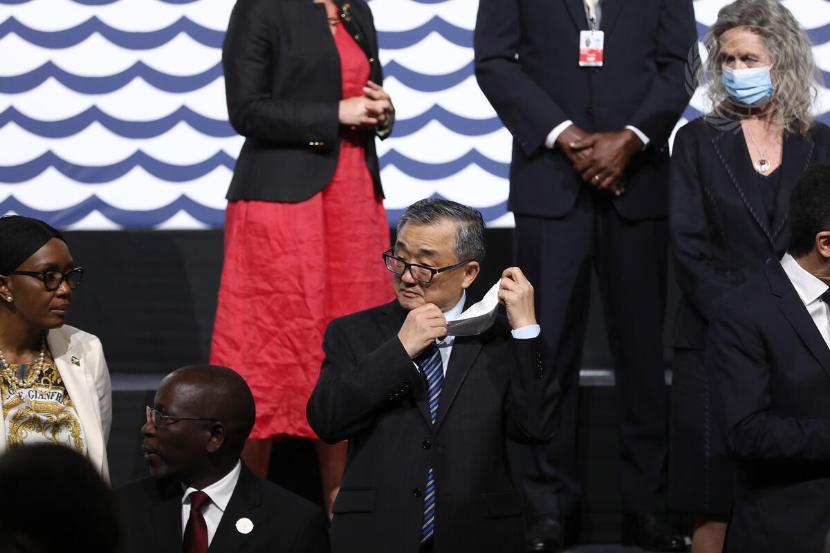 A view of Liu Zhenmin (centre), Under-Secretary-General and Head of Department of Economic and Social Affairs, and participants during the United Nations 2022 Ocean Conference in Lisbon, Portugal.