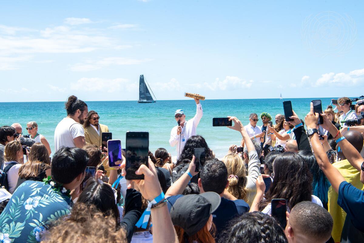 Peter Thomson (centre), UN Secretary General’s Special Envoy for the Ocean, holds up the Nature Baton at the Youth and Innovation Forum on the side of the 2022 UN Ocean Conference, held at Carcavelos Beach, outside of Lisbon, in Portugal. To his right is Jason Momoa, Actor and Advocate on Oceans, who is designated the UN Environment Programme’s (UNEP) Advocate for Life Below Water (27 June). Mr. Momoa arrived on a boat to receive the Nature Baton from the UN Special Envoy for the Ocean, Peter Thomson. Momoa then handed the baton to youth representatives before they, in turn, passed it to the UN Secretary-General. The Nature Baton, a global collaboration for the ocean’s wellbeing, has shone a spotlight on the need for action to save the world’s ocean, and is a metaphor for the journey ocean champions have taken this year from Brest to Nairobi for the UN Environment Assembly, to Palau for the Our Oceans Conference, and for World Environment Day in Stockholm, on the road to Lisbon.
