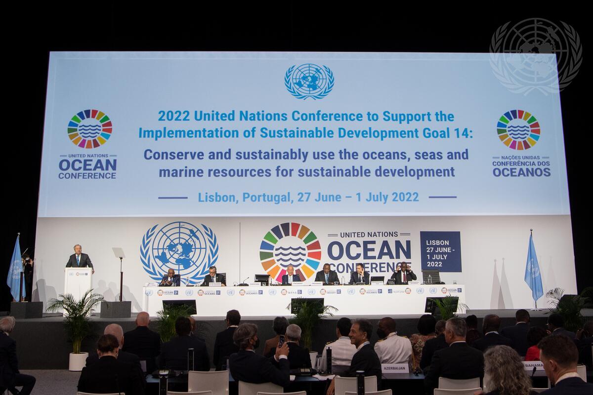 Secretary-General António Guterres (left at podium) delivers opening remarks to the United Nations 2022 Ocean Conference in Lisbon, Portugal.